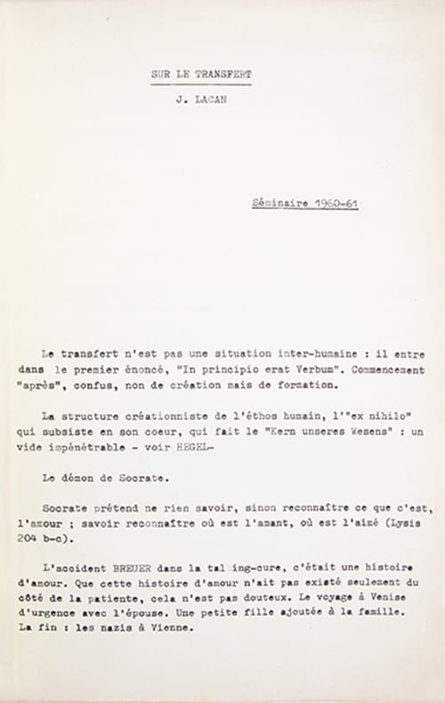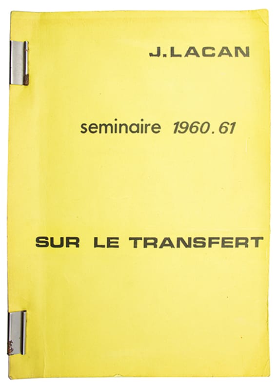 Impression en ronéotypie du texte du séminaire donné par Jacques Lacan durant lannée 19601961, destinée aux participants ou à un cercle proche danalystes, délèves et de membres de la Société française de psychanalyse. La diffusion demeurait limitée, sans statut éditorial officiel.Ce séminaire VIII, intitulé "Le transfert", constitue lun des enseignements majeurs de Lacan. Donné à Paris, principalement à lhôpital Sainte-Anne, il reprend le concept freudien du transfert pour analyser la relation entre lanalysant et lanalyste, en sappuyant sur une lecture du Banquet de Platon.Les notes dactylographiées présentent un intérêt historique et documentaire considérable. Elles donnent accès à un Lacan plus spontané, parfois plus tranchant, et plus étroitement inscrit dans la situation du séminaire.Des espaces laissés vides dans le texte ont été complétés par des citations en caractères grecs.Très bon exemplaire.