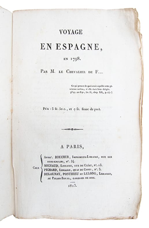Edition originale de ce témoignage de première main sur lEspagne de la fin du XVIIIe siècle.Officier au service de la France, Bernard-François-Anne, chevalier de Fonvielle (1760-1839), séjourna dans la péninsule Ibérique dans le cadre de lalliance diplomatique et militaire franco-espagnole, à des fins dobservation stratégique et politique. Son récit offre une description précise des villes, des paysages, des institutions et des murs.Il sinscrit dans la tradition de la littérature de voyage des Lumières tardives, alliant enquête empirique et réflexion critique. Louvrage constitue une source de premier ordre pour létude de lEspagne pré-napoléonienne.Demeuré à létat de manuscrit, louvrage fut publié en 1823, à petit nombre d'exemplaires, à loccasion de lintervention militaire française, connue sous le nom de "lexpédition dEspagne", visant à restaurer Ferdinand VII sur le trône dEspagne.(Foulché-Delbosc, 'Bibliographie des Voyages en Espagne', n° 213. Palau y Dulcet, 2e éd., n° 93461).Bon exemplaire, imprimé sur papier vergé fort, entièrement non rogné, tel que paru.