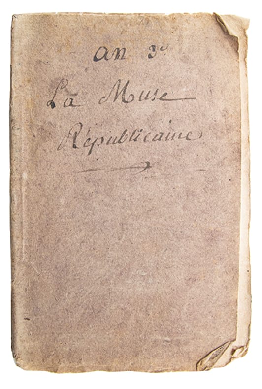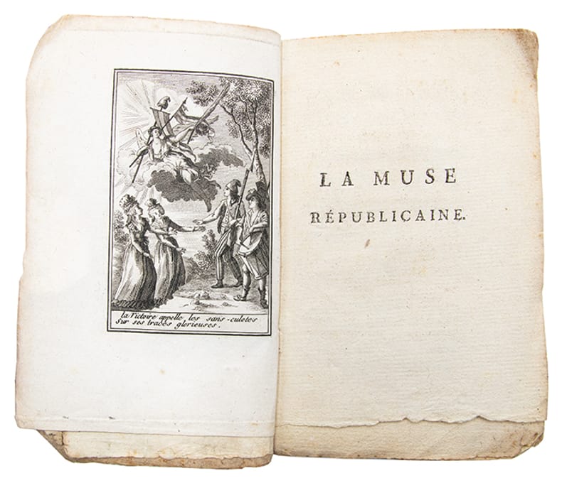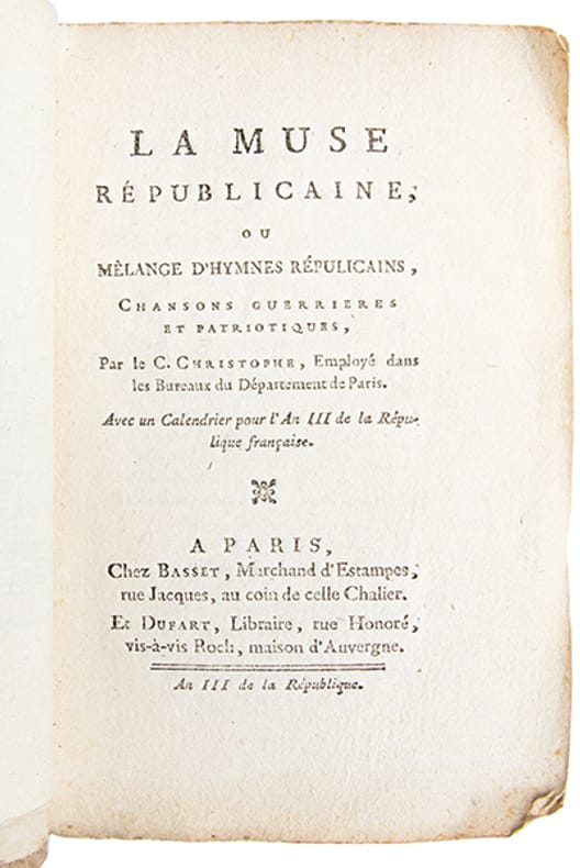 Rarissime chansonnier républicain, demeuré à ce jour inconnu.Le volume souvre sur un frontispice allégorique figurant la Victoire appelant les sans-culottes, hommes et femmes, à suivre la voie glorieuse de la Révolution. La composition associe figures populaires, emblèmes militaires et imagerie céleste afin dexalter lengagement civique du peuple. Conçue comme un manifeste visuel, cette gravure confère à louvrage la portée dun véritable instrument de propagande et constitue un témoignage significatif de la culture politique et iconographique des sans-culottes.Publié dans les derniers mois de la Terreur, le recueil réunit des hymnes et des chansons pour la plupart inédits (sf. "lymne à lÊtre suprême" de Chénier), destinés à exalter les idéaux de la Nation, à cimenter lunité patriotique et à entretenir la ferveur révolutionnaire. Lauteur se désigne sur la page de titre comme "employé dans les bureaux de Paris". Le volume est en outre enrichi dun calendrier républicain pour lan III, doté dune page de titre distincte.Cet exemplaire paraît unique. Il manque à lensemble des bibliographies spécialisées ainsi quaux grands catalogues collectifs nationaux et internationaux, notamment le CCFr, la BnF, WorldCat et le KVK.Très bon exemplaire, parfaitement conservé, très frais, imprimé sur papier vergé fort, entièrement non rogné, sous sa première couverture de papier gris titré à l'époque à la plume sur le premier plat.