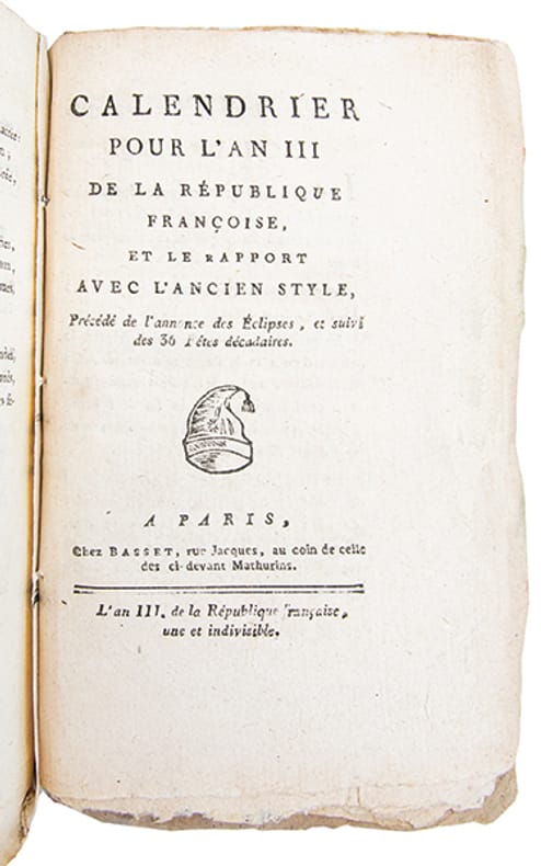 In-16 (144 x 92 mm), broché, couverture muette grise d'origine, 72 et (16) pages (de calendrier), planche frontispice gravée, exemplaire entièrement non rogné, tel que paru. A Paris, chez Basset, et Dufart [Imprimerie de Rochette], An III [1794-95].