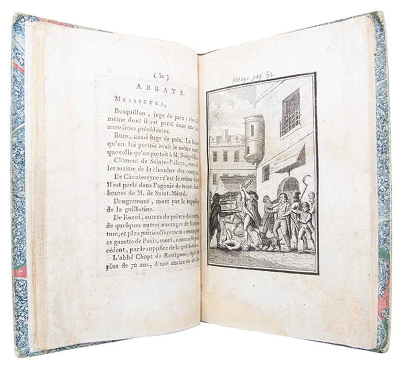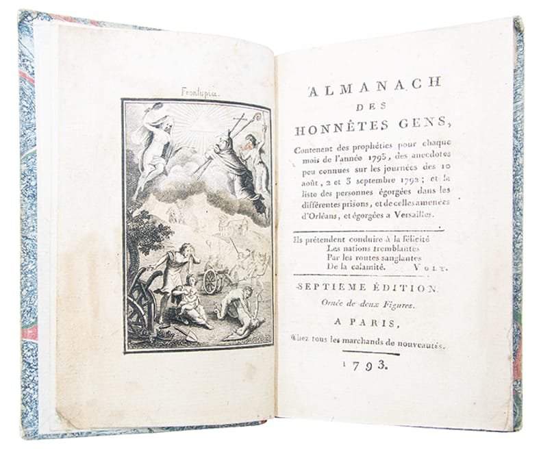 Septième édition, la plus complète selon Grand-Carteret, de cet almanach contre-révolutionnaire, illustrée de deux planches figurant des scènes de massacres.Par Galart de Montjoie, pseudo. de Félix Ventre de La Touloubre (1746-1816), ancien rédacteur de "LAmi du Roi", futur conservateur de la bibliothèque Mazarine. Louvrage a été attribué à tort à Sylvain Maréchal.Lalmanach réunit prophéties, fables et réflexions politiques, accompagnées danecdotes sanglantes sur les journées révolutionnaires daoût et septembre 1792.Il comprend des listes détaillées des victimes, classées par lieux de détention, formant un véritable mémorial des exécutions. Sont notamment évoqués les massacres de lHôtel de la Force et du couvent des Carmes, ainsi que le sort réservé à la princesse de Lamballe, avec, in fine, une liste des personnes "amenées dOrléans pour y être égorgées à Versailles".Le ton, visant à dénoncer la barbarie révolutionnaire et à susciter lindignation du lecteur, est violemment polémique: "Des monstres furieux buvoient le sang humain" (p. xxi).(Grand-Carteret, Almanach, 'Almanach', 1087. Monglond, II, col. 960-961. Tourneux, 3487c).Ex-Libris gravés d'Etienne Délicourt (1809 - 1883) et de Jacques Laget.Rousseurs, taches et brunissures éparses.Exemplaire bien relié à l'époque.