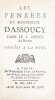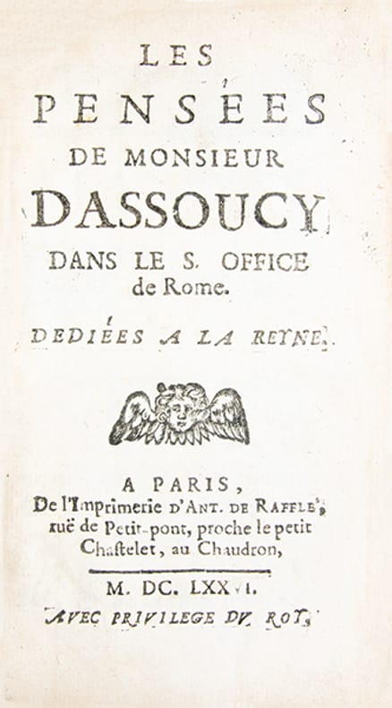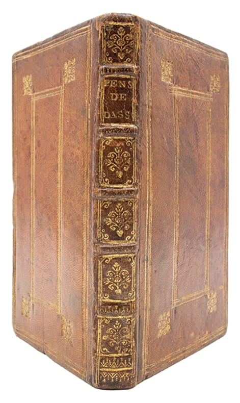 Édition originale de cette oeuvre singulière de Charles Coypeau dAssoucy (16041674), écrivain, poète burlesque et musicien accompli, proche de Molière et du cercle des libertins érudits. Les "Pensées" furent rédigées lors de son emprisonnement à Rome, en décembre 1667, après son arrestation pour faits présumés dathéisme et de libertinage."Vers 1662, il partit pour Rome ; il y mena une vie de luxe et de paresse, jusquau jour où ses attaques contre certains prélats réveillèrent des accusations de libertinage portées contre lui et le firent enfermer dans les prisons du Saint-Office" (Grente, 'Dict. XVIIe', p. 77-78).Depuis sa prison, lauteur développe une réflexion critique sur les diverses formes de dissidence religieuse, protestants, déistes, athées ou panthéistes. Mêlant autobiographie, polémique et satire, louvrage revendique avec force la liberté de conscience et le droit au libre examen. Plus quun traité philosophique, il constitue un témoignage rare sur la condition des libertins érudits au XVIIe siècle, porté par une écriture personnelle où alternent gravité et burlesque.Cyrano de Bergerac, présenté comme un proche, est évoqué, de même que ses "Empires de la Lune", aux pages 50 à 53.Homosexuel et libertin revendiqué, dAssoucy fut emprisonné à trois reprises pour des chefs daccusation de sodomie aggravés dimpiété ; il ne dut son salut quà de puissantes protections, jusquà lintervention royale de 1673 (cf. M. Alcover, "Un gay trio: Cyrano, Chapelle, Dassoucy", in 'LAutre au XVIIe s.', p. 265275).(Mongrédien, 'Bibliographie des oeuvres de Dassoucy', R.H.L.F., 1932, I, p. 101-102, n°5).Rare, seulement cinq exemplaires sont conservés en institutions publiques.Quelques petites épidermures.Provenance Hyacinthe Théodore Baron (1707-1787), médecin militaire et bibliophile français, avec son ex-libris armorié gravé.Très bel exemplaire dans une jolie reliure de maroquin à la Duseuil de l'époque.