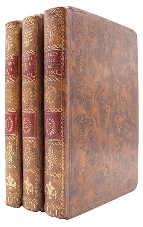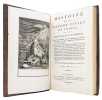 3 volumes in-8 (198 x 122 mm), veau raciné de l'époque, dos lisses ornés de compartiments garnis de 4 fers spéciaux dorés aux centres, palette en pied, pièces de titre et de tomaison de maroquin rouge, roulette d'encadrement à froid sur les plats, roulette sur les coupes, tranches mouchetées rouges, gardes de papier dominoté, (4), xvi, 362 p. dont un frontispice, (2), 420 p. et (2), 516 p. Paris, chez Lerouge, 1803.
