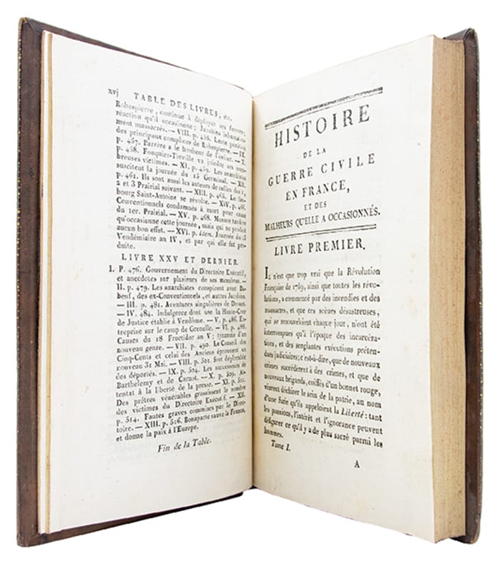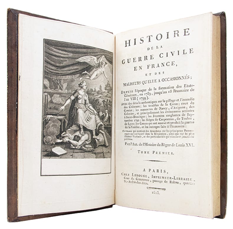 Unique édition de cet ouvrage rare et peu cité de Nougaret, ornée dun frontispice allégorique avant la lettre, figurant la France en armes, écrasant la Terreur, dominant le chaos, la guillotine visible à larrière-plan, et rétablissant la prospérité.Lhistoire couvre la période de 1789 au 18 Brumaire 1799 ; le titre complet annonce le vaste programme de louvrage : "avec les détails authentiques sur le pillage et lincendie des châteaux, les troubles de la Corse (), des colonies et notamment de Saint-Domingue (), les journées de septembre 1792 (), les sièges de Carpentras, de Toulon, de Lyon (), la guerre de la Vendée", ainsi que sur les acteurs et les victimes.Témoin direct des événements en qualité de chef du bureau de surveillance à la Commune de Paris, Nougaret propose un récit dinspiration contre-révolutionnaire, véritable plaidoyer pour le retour à une autorité forte incarnée par Napoléon Bonaparte.Lavertissement dénonce "lamour désordonné de la liberté" et les ambitions dissimulées sous le masque du patriotisme.(Tourneux, I, n° 89).Rares rousseurs ; manque de cuir aux plats et aux coiffes inférieures du premier volume.Bon exemplaire, relié à lépoque.