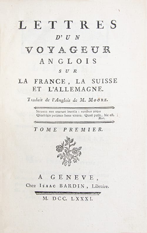 Édition originale de la traduction française, par Henri Rieu, de A View of Society and Manners in France, Switzerland and Germany (Londres, 1779), ouvrage de John Moore. Médecin écossais, Moore parcourut lEurope de 1772 à 1776 comme précepteur du duc dHamilton, séjournant notamment à Genève puis en Allemagne. Louvrage, en deux volumes et sous forme de lettres, mêle observations réelles et dispositif fictionnel dun correspondant anglais. Le premier volume est principalement consacré à la France, surtout Paris, tandis que le second développe les observations sur la Suisse (Genève en particulier) et les États allemands. Lensemble offre une analyse des murs, des usages sociaux et de la diffusion du modèle français en Europe, accompagnée danecdotes sur des personnages contemporains.Une suite devait paraître sur l'Italie.Manques de cuir aux plats, coiffes et coins, galeries de vers au deuxième volume, pièce de titre du second volume manquante.Intérieur très frais.
