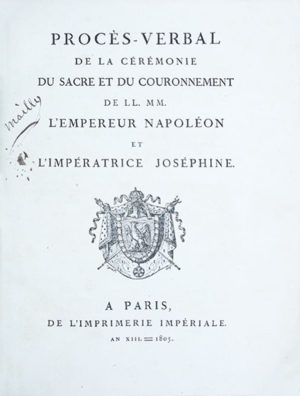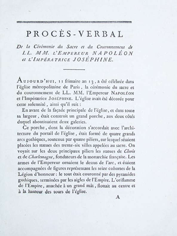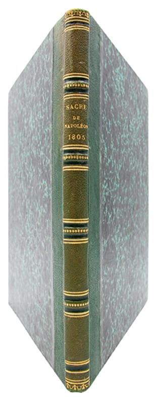 Édition originale du procès-verbal de la cérémonie du sacre de Napoléon, rédigée sous la direction de Louis-Philippe de Ségur, grand maître des cérémonies de cette journée historique.Ce document officiel, précis et dune grande richesse descriptive, retrace avec minutie le déroulement de la cérémonie. Il en détaille chaque étape, énumère les personnalités présentes, indique la disposition des tribunes, décrit le décor intérieur et extérieur de la cathédrale de Paris, et reproduit les textes des discours, oraisons et autres interventions prononcés au cours de lévénement.(Davois, III, 116. Monglond, VI, 958).Ex-libris manuscrit en page de titre "Mailly".Petite déchire au coin inférieur de la page 67.Bel exemplaire, très frais, très bien relié, imprimé sur grand papier de Hollande bleuté.