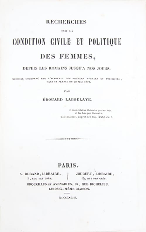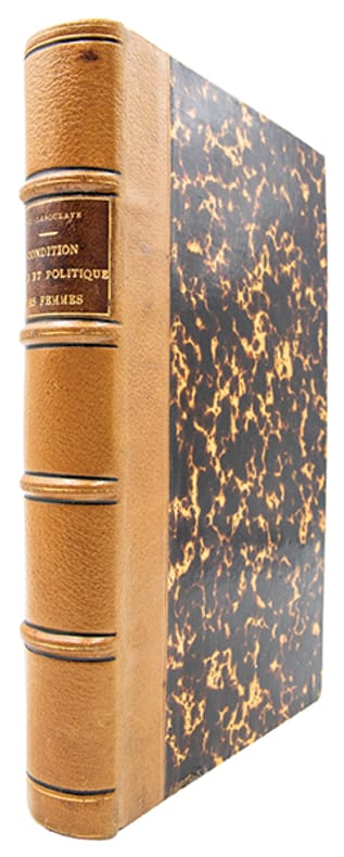 Edition originale de cet ouvrage, jalon précoce dune réflexion menée dans les milieux libéraux français du XIXe siècle sur lévolution historique des institutions et sur la condition des femmes.Laboulaye y retrace, à travers une enquête dhistoire du droit comparée, la formation de leur statut civil et politique dans les sociétés européennes depuis lAntiquité jusquà lépoque moderne, et souligne le caractère historique des incapacités qui leur sont imposées, plaidant pour une évolution, modérée, de leur condition sociale et civile.L'ouvrage fut couronné par l'Académie des sciences morales et politiques.Cf. C. Goldberg Moses, 'French Feminism in the 19e c.', 1984. G. Fraisse, 'Muse de la raison', 1989, passim.(Goldsmiths'-Kress, n° 33428. 'Gerritsen collection of women's history', n°1575. Rozière, 'Laboulaye', n°13). Piqûres et rousseurs éparses.Bel exemplaire, très bien relié à l'époque de demi-maroquin citron.