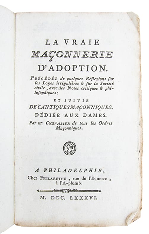 Le faux-titre de cette édition porte : "Manuel des Franches-Maçonnes ou la vraie Maçonnerie d'adoption". Le "Cantique de clôture" se trouve pages 97-98.L'un des premiers ouvrages français sur l'initiation des femmes, reconnues dans l'épître introductive "aussi libres & aussi raisonnables que nous" [les hommes] : loges d'adoption, réception, grades, compagnonnage, Maîtresse parfaite, Autel du feu et de la vérité, ornements et bijoux, etc. (Cf. Caillet, 4850. Dorbon, 2044. Fesch, 723).Petit accroc de papier à la dernière page, sans perte.Très bon exemplaire, imprimé sur papier fort, tel que paru entièrement non rogné sous sa couverture de papier d'attente d'origine.
