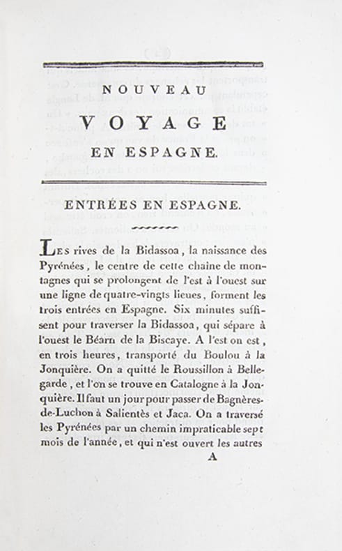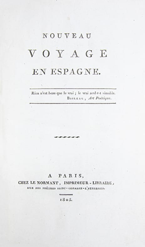 Seconde édition de ce récit de voyage qui est l'un des plus exacts et des mieux composés pour le XVIIIe s. La première édition est de Genève (1780). D'après Barbier, André Morellet en aurait corrigé le style. Pour Quérard, les descriptions et les récits de ce livre "étant d'une fidélité parfaite, ont servi de guide aux dessinateurs employés à la confection du Voyage pittoresque en Espagne". Outre les parties descriptives concernant les monuments et les moeurs de habitants de chaque province, on y trouve des détails sur la tauromachie et un important passage sur l'Inquisition espagnole qui rapporte plusieurs faits curieux notamment la description détaillée de l'autodafé de Madrid de 1680. Barbier III, 525; Quérard VII, 108; cat. Bibliothèque Max, n°449.