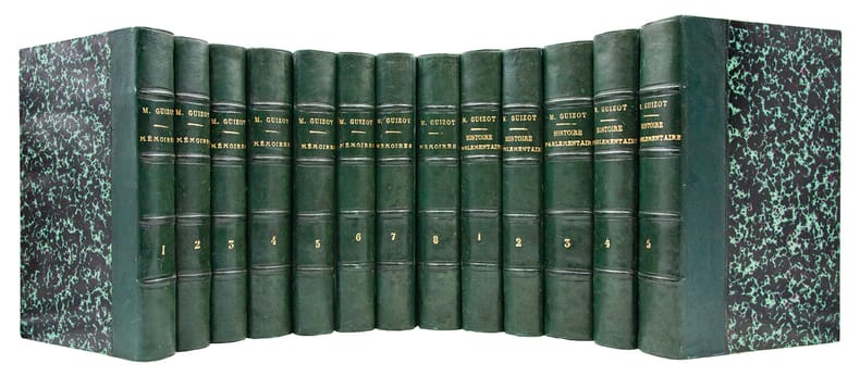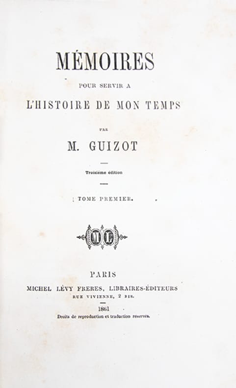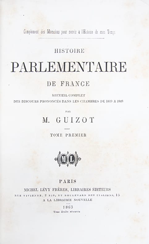 Pour les Mémoires (8 volumes): édition en partie originale le tome I est donné en troisième édition, le tome II en seconde édition, les tomes suivants en édition originale. Pour l'Histoire parlementaire (5 volumes): édition originale et unique tirage.François Guizot (1787-1874) fut le principal théoricien du libéralisme doctrinaire et l'architecte de la politique dite du "juste milieu" qui définit l'esprit de la monarchie de Juillet et marqua durablement la pensée constitutionnelle française.Les deux ouvrages ici réunis constituent un monument pour l'histoire de cette période. Les 'Mémoires', qui s'étendent de 1807 à la révolution de 1848, constituent l'une des sources principales pour l'intelligence de la vie politique de la Restauration et de la monarchie de Juillet (Bertier, n° 508). 'L'Histoire parlementaire', complément organique des 'Mémoires', rassemble l'intégralité des discours prononcés par Guizot aux Chambres de 1819 à 1848: "Le document indispensable et l'un des témoignages les plus importants pour l'histoire de la Restauration et de la monarchie de Juillet" (Rosanvallon, 'Moment Guizot', p. 383. Vicaire, III, 1175).Quelques rousseurs éparses.Bel exemplaire, très bien relié, formant un ensemble homogène et cohérent de 13 volumes.