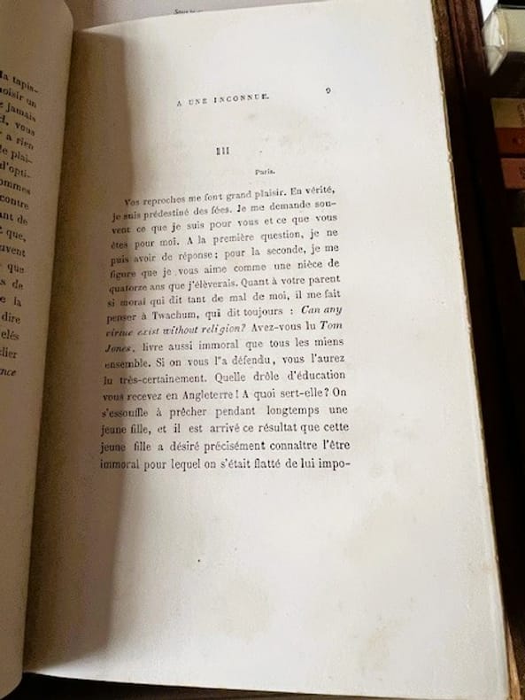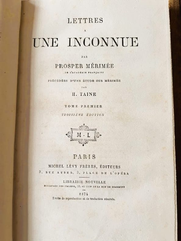 Vicaire, Manuel de l'amateur 5, 741. - Edition originale. - "Jeanne-Françoise, dite Jenny Daquin, "l'Inconnue" (25 novembre 1811 - 25 mars 1895). Fille de Julien Dacquin, notaire à Boulogne-sur-Mer, elle a fait des études en Angleterre. En 1831, la petite provinciale de vingt ans, après avoir lu la Chronique du temps de Charles IX, écrit à Prosper Mérimée sous le pseudonyme de Lady Algernon Seymour, poste restante à Calais, et sollicite un autographe. Peu après, son père meurt et elle devient dame de compagnie en Angleterre. Une correspondance s'instaure entre Mérimée et elle. Ils se rencontrent pour la première fois le 29 décembre 1832 à Boulogne-sur-Mer. Ils continuent à correspondre mais ne se revoient pas pendant dix ans.En 1842, Jenny fait deux héritages et s'installe à Paris, rue de l'Oratoire, puis rue Jacob. Ils recommencent alors à se voir mais toujours dans des lieux publics ou pour de longues promenades. Mérimée tait cette amitié, la cache. Cette liaison fut peut-être alors plus que platonique. Quoiqu'il en soit, cette "amitié" demeure une constante dans la vie de Mérimée jusqu'à sa mort. En 1873 l'édition, truquée et tronquée des Lettres à une inconnue par P. Mérimée, précédée d'une étude sur Mérimée de Taine, excite la curiosité de la critique. C'est la première des éditions de la correspondance de Mérimée après son décès (331 lettres qui vont de 1832 à 1870, la dernière est du jour même de sa mort)." - Sans les couvertures, sinon bel exemplaire.