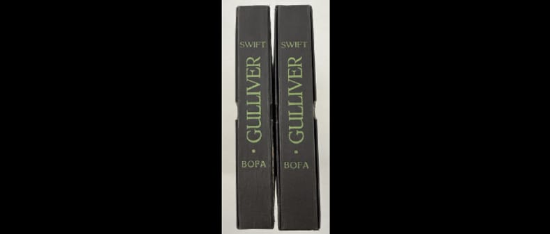 Bruxelles Editions du Nord 1929 2 volumes in-4, dos et larges bandes en maroquin vert fonçé, plats recouverts de papier vert imitation bois, listels horizontaux mosaïqués en maroquin vert et filets dorés horizontaux sur les bandes et les dos lisses portant le titre mosaïqué en maroquin vert et des noms de l'auteur et de l'illustrateur poussés or; doublures et gardes de papier vert imitation bois, têtes dorées, non rognés, couvertures illustrées (Marot-Rodde).Ce livre illustré par Gus Bofa comporte 30 eaux-fortes originales hors texte en noir et 36 culs-de-lampe gravés sur bois par l'artiste et tirés en bleu, vert, rouge ou ocre. Tirage limité à 360 exemplaires numérotés. Exemplaire numéroté sur hollande.