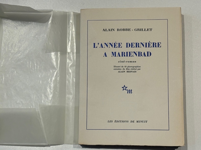 Édition originale. Un des 80 exemplaires numérotés sur vélin pur fil, seul tirage en grand papier avec 10 ex hors commerce N° 14. Ouvrage illustré de 48 planches photographies hors-texte extraites du film réalisé par Alain Resnais sur 24 planches hors-texte de papier couché. Édition originale du scénario incluant le découpage et les dialogues, précédé d'une introduction de l'auteur. Il s'agit de la version qu'Alain Robbe-Grillet remit à Alain Resnais avant le tournage de L'année dernière à Marienbad et qui présente de très légères variantes avec ce film culte. Le sous-titre " ciné-roman ", inventé pour cette publication, sera désormais accolé aux autres livres d'Alain Robbe-Grillet tirés de ses films, comme un label du Nouveau Roman. Très bel exemplaire. Photos sur demande.