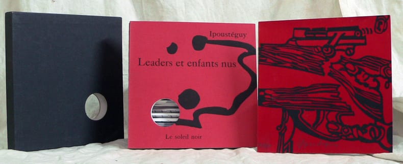 Paris Le Soleil Noir 1970 28x28x9cm Leaders et Enfants nus Paris, Le Soleil Noir, 1970, 28x28x9 cm. Série A. Livre objet. L'un des 135 exemplaires sur pur fil Johannot, 154 pp., numérotés 1 à 135, chacun de ces exemplaires étant intégré dans un livre sculpture construit en aluminium. Cette ouvre originale d'Ipoustéguy contient une suite de neuf plaques mobiles gravées sur de l'aluminium oxydé anodiquement et coloré au bain. Le livre sculpture et les gravures sur aluminium ont été signés et numérotés à la pointe d'acier par l'auteur. NBK p.210-211, reproduit; Nicaise catalogue 17, 1975, n°325, reproduit; BPI Centre Pompidou décembre 1979, article et reproduction in n°14, "sauf mardi"; Clef, Bordeaux 1979, n°247; Lecointre Ozanne 1991 p.26-27; Carré d'Art Nîmes n°44 ; Boîtes Arc 76-77, reproduit (100305)