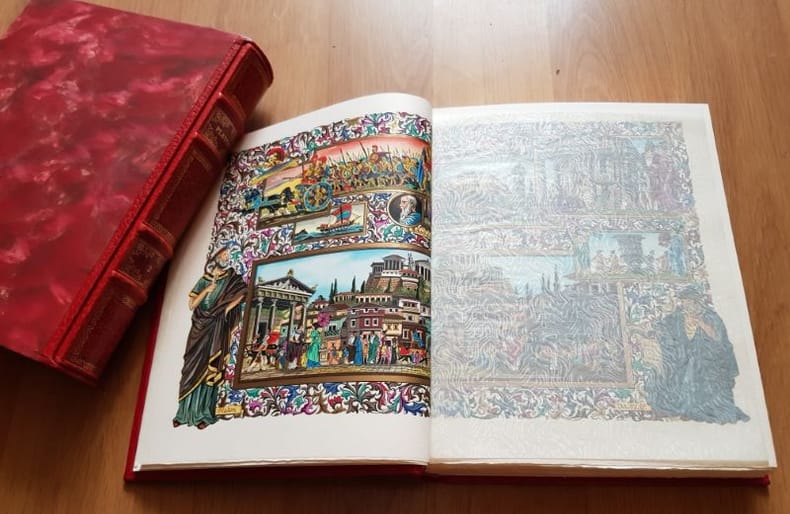 Très nombreuses illustrations en couleur hors-texte protégées par un cristal, dont une en double-page. Chaque volume contient une suite en rouge carmin des illustrations hors-texte. Bel exemplaire en parfait état. Photos sur demande.