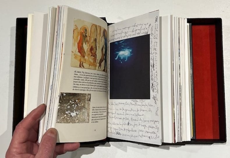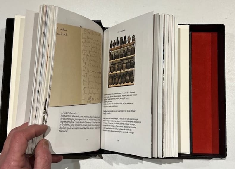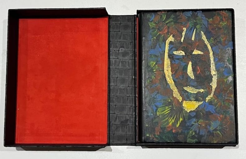 Paris, Mercure de France, Traits et Portraits, 1924.. in-8, couverture illustrée, 255 pp + 8 ff n.ch (table des illustrations). Superbe reliure plein veau noir. Reliure peinte avec pochoir trois couleurs. Impression originale d'un portrait (recto) et d'un poisson (recto) toile de jute imprimée. Boîte de toÏle avec impression à chaud ajouts de cabochons rouge et jaune plats et dos. Dorure : Atelier La Feuille d'Or titre à la chinoise plus pièce de titre sur la boîte. (couv et dos conservés).