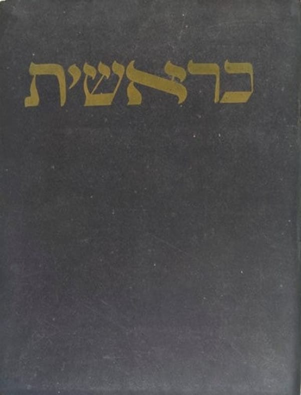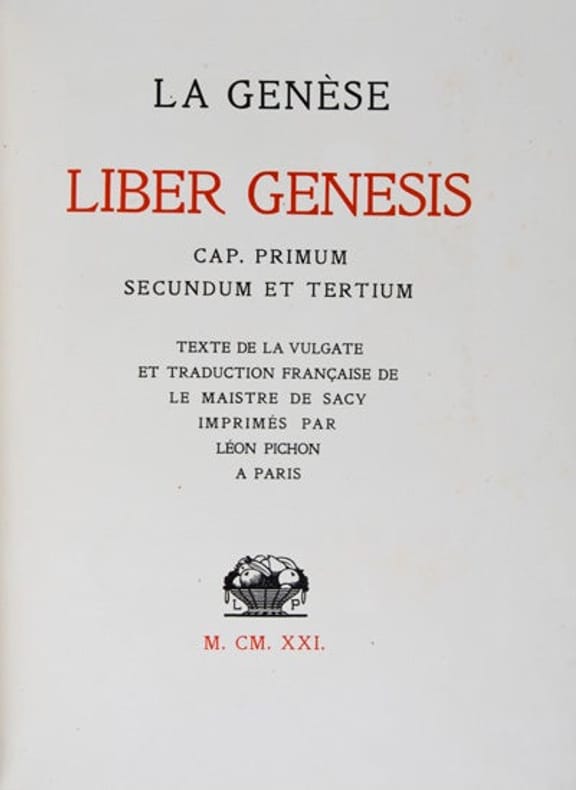 Paris, Imprimé par Léon PICHON. 24 février 1921. In-folio (28 x 37 cm) broché, couverture noire rempliée et. dos lisse 61 -[1] pp. Léger manque de papier noir sur les coiffes. Texte en latin imprimé en rouge tiré de la Vulgate avec la traduction française imprimée en noir d'après le Maistre de Sacy.