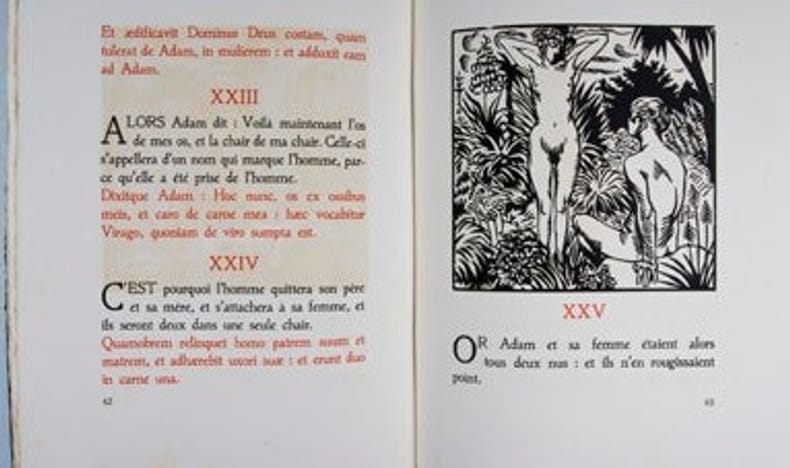 Texte en latin imprimé en rouge tiré de la Vulgate avec la traduction française imprimée en noir d'après le Maistre de Sacy. Gravures sur bois par HERMANN PAUL. Tirage limité a quatre cent quatre-vingts exemplaires (480 ex) numérotés et paraphés par l'éditeur Léon Pichon (signature au crayon papier). Un des 430 exemplaiies numérotés sur vergé à la cuve des Papeteries d'Arches numérotés à la main. N° 221. bEL EX. Photos sur demande.