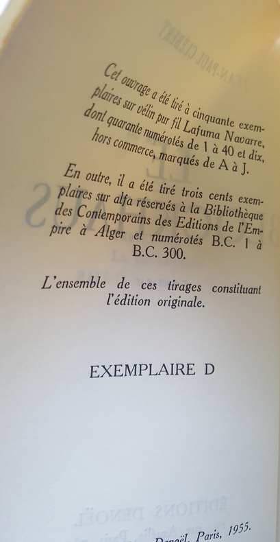 Edition originale. Un des 50 exemplaires du tirage de tête sur vélin pur fil Lafuma Navarre et un des dix exemplaires hors commerce marqué de A à J (D) sous couverture spéciale. Bel exemplaire. Non coupé. PRIX PORT ENVOI EN COLISSIMO INCLUS POUR LA FRANCE MÉTROPOLITAINE (Forfait de 5 euros déductible pour une remise en main propre. Nous consulter pour un envoi vers une autre destination).