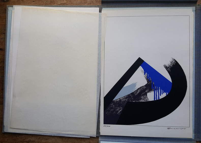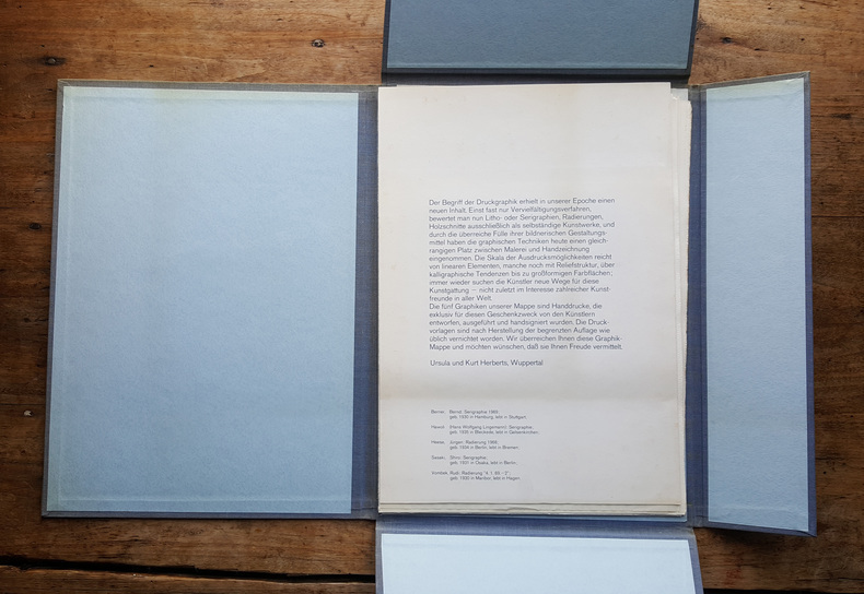 Texte d'une page en allemand. Oeuvres tirées à 400 exemplaires numérotées et signées par les artistes. Une sérigraphie de Bernd Berner, une sérigraphie de Hans Wolfgang Lingermann Hawoli, une gravure de Jürgen Heese, une sérigraphie de Shiro Sazaki, une gravure de Rudi Vombek. Bords de la chemise un peu décolorées par le temps sinon bel exemplaire.