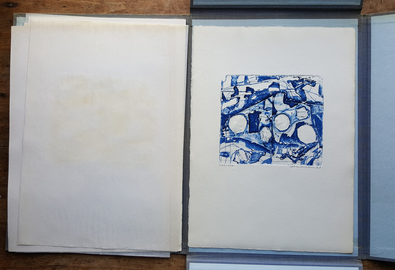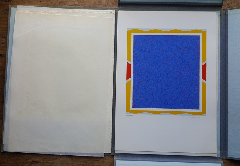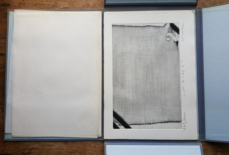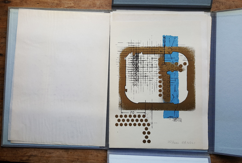 s.l. (Wuppertal), s.e., s.d (1969) chemise cartonnée toilée à rabats avec pièce de titre contenant une page de texte et cinq gravures et sérigraphies sous serpentes