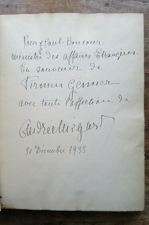"Sans date ni justification de tirage (vers 1920 ?). Illustrations (vignettes) hors-texte en couleurs de Edmond Dulac (Edmund) sous serpentes légendées. Précieux exemplaire revêtu de l'ex-libris de Fernand Gémier et portant un ex-dono d'une tierce personne à l'homme politique Joseph Paul-Boncour: "" Pour J. Paul-Boncour Ministre des Affaires étrangères. En souvenir de Firmin Gémier avec toute l'affection de Andrée Mégard 30 décembre 1933"" [Actrice et épouse de Firmin Gémier]. L'acteur Firmin Gémier était mort quatre jours plus tôt. Exemplaire sur beau papier fort. Epidermures et usures aux coins. Sans rousseurs. Reliure signée Flammarion Vaillant."