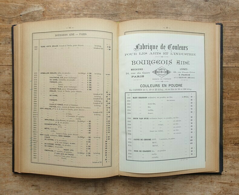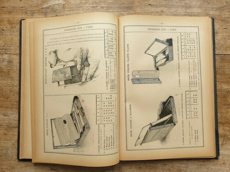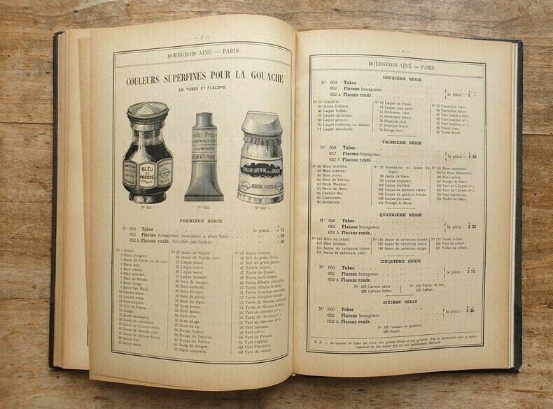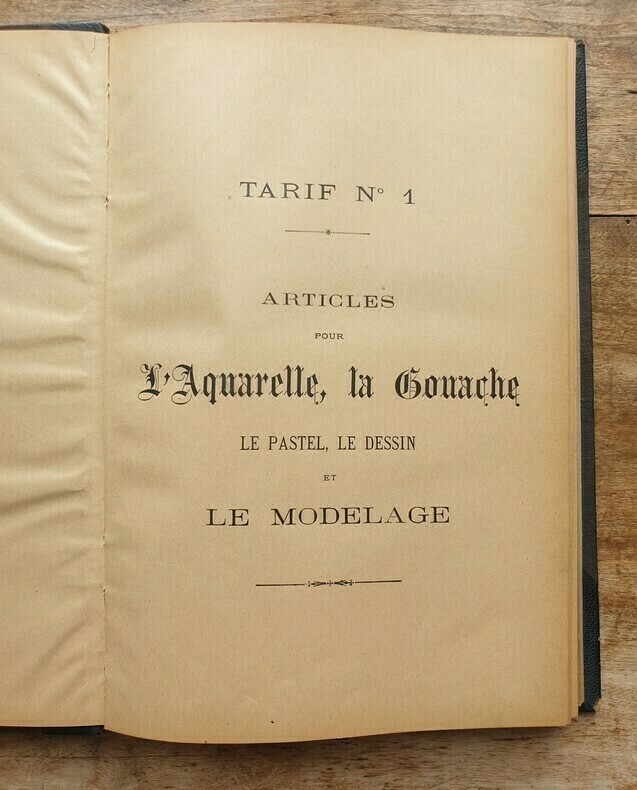 "Tarif n°1: Articles pour L'Aquarelle, La Gouache, Le Pastel, Le dessin, et le modelage (page 1 à 103). Tarif n°2: Articles pour la Peinture à l'huile (p. 107 à 168). Tarif n°3: Articles pour la Peinture sur Porcelaine (p169 à 185). Tarif n°4: Librairie et Articles pour la Photo-Aquarelle, La Photo-Miniature, La Photo-Peinture, La Peinture Email et la Métallisation (p 187 à 208). Tarif n°5: Comprenant les couleurs en poudre et en nature pour les arts et l'industrie, les couleurs en poudre impalpable surfine pour le broyage à tableaux (spécialité de la Maison), les couleurs broyées à l'essence pour la carosserie et la décoration, les couleurs sans danger pour les fabricants de jouets (autorisés par la Conseil d'Hygiène et de Salubrité); Les Vernis pour équipages et bâtiments; pour les couleurs superfines préparées et le matériel de Peinture à l'huile, aquarelle etc. (20 pages). Tarifs n°6: Couleurs et accessoires pour le Dessin industriel pour les couleurs superfines et le matériel de Peinture à l'huile, aquarelle etc. (20 pages). Reliure solide avec des manques et des épidermures. Document exceptionnel richement illustré de dessins du matériel proposé à la vente à l'époque impressionniste. Une note manuqcrite indique en page de garde ""Maison fondée en 1867, 31 rue du Caire, Usine 22 passage Tocanier. Bel exemplaire."