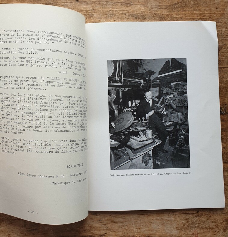 Tirage limité et numéroté à 500 exemplaires. Filmographie, texte de Boris Vian, témoignages. Dix documents et photographies en noir hors texte. Dessin s de siné en quatrième de couverture. Impression ronéotée (caractère de machine à écrire).Petites traces d'usure, menus défauts, bon exemplaire. Rare.