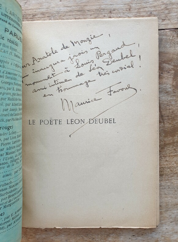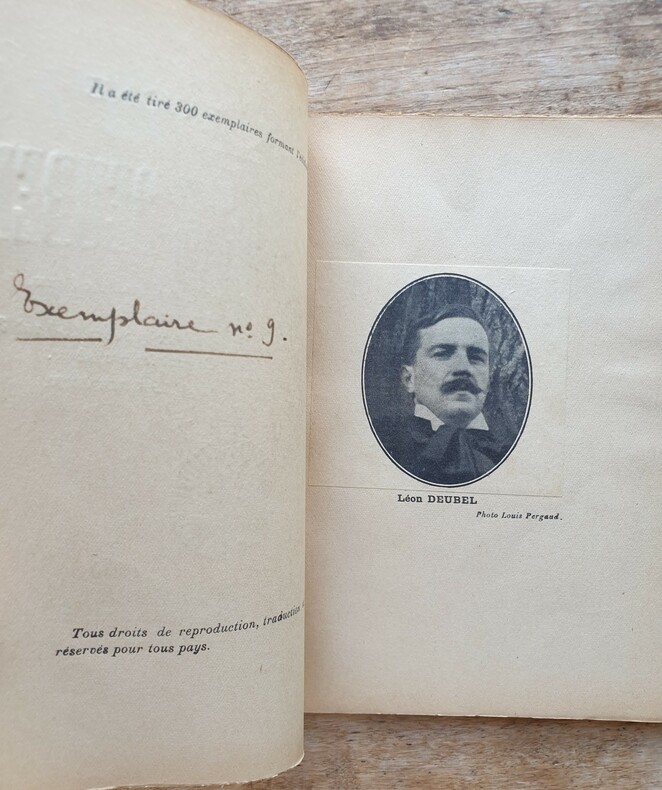 Chez l'auteur, en 1950, à Saint-Germain-des-Prés. 22 x 13 cm, non paginé. Plaquette agrafée, bon exemplaire. Catalogue des documents sur Léon Deubel faisant partie de notre exposition du cinquantenaire de la revue de Léon Bocquet "Le Beffroi". Le poète Léon Deubel (1879-1913), pauvre, inadapté à la vie sociale, s'est suicidé en se jetant dans la Marne après avoir brûlé tous ses manuscrits. Le 12 juin 1913, des mariniers retirent de la Marne le corps de Léon Deubel, décédé vers le 6 juin. Il a alors six sous en poche.