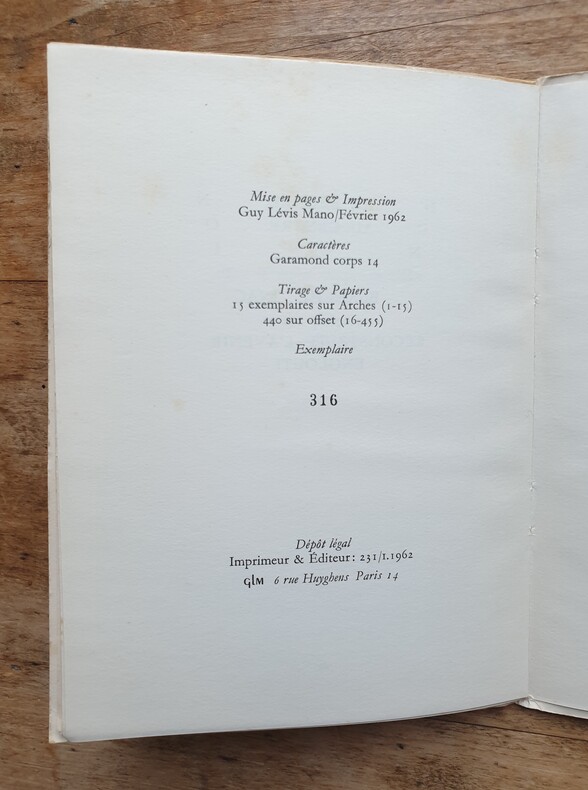 Paris: Guy Lévis Mano (GLM), février 1962. Un volume 19,8x14,6cm broché de (44) pages sous couverture blanche imprimée. Bon état. Édition originale tirée à 455 exemplaires: 1/440 sur papier offset.