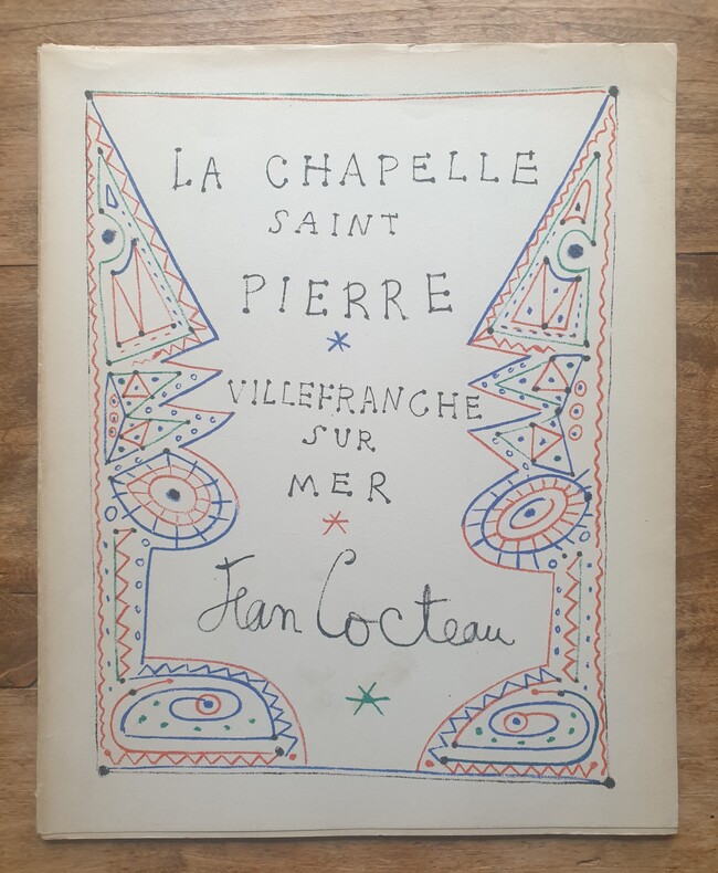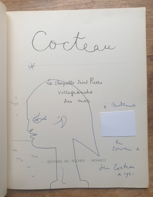1957 Monaco, Editions du Rocher, 1957; petit in-4° broché, dos muet, jaquette blanche illustré en couleurs d'une composition de Jean Cocteau; (40)pp. dont titre et présentation de Cocteau ( 8pp.) et 3 photographies à plaine page montrant Jean Cocteau en train de peindre à la chapelle, toutes les autres reproduisent l'oeuvre de Cocteau.Exemplaire enrichi , sous le fac-similé d'écriture de Cocteau servant de titre, d'un envoi autographe signé du peintre “ Souvenir amical…“, daté 1957.