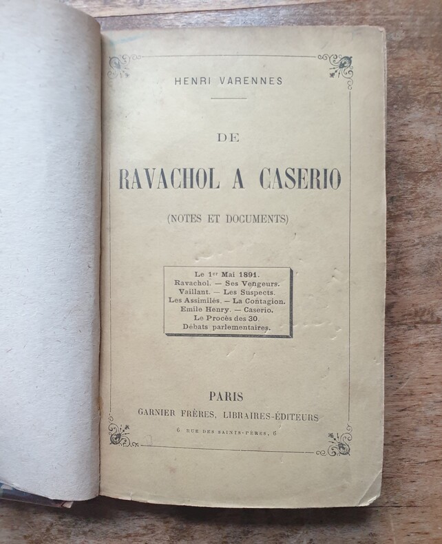 """Le 1er mai 1891. Ravachol - Ses Vengeurs - Vaillant - Les Suspects - Les Assimilés - La Contagion -Emile Henry - Caserio - Le Procès des 30 [trente] - Débats parlementaires. Reliure muette cassée (manque tout le dos et plats sont pratiquement totalement détachés). Couvertures conservées, intérieur frais. Rare. PRIX PORT ENVOI EN COLISSIMO INCLUS POUR LA FRANCE MÉTROPOLITAINE (Forfait de 5 euros déductible pour une remise en main propre. Nous consulter pour un envoi vers une autre destination)."