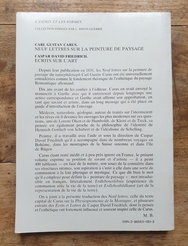 Présentation de Marcel Brion (46 pages). Réunion en un volume de neuf lettres de C.G. Carus traitant de la peinture de paysage suivies d'un choix de textes de C.D. Friedrich. Traduit de l'allemand par Erika Dickenherr, Alain Pernet et Rainer Rochlitz. Quelques illustrations en noir. Bel exemplaire. PRIX PORT ENVOI EN COLISSIMO INCLUS POUR LA FRANCE MÉTROPOLITAINE (Forfait de 5 euros déductible pour une remise en main propre. Nous consulter pour un envoi vers une autre destination).
