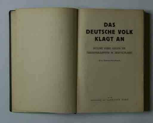 "Texte en allemand (""le peuple allemand accuse""). Edition originale de ce texte anti-nazi. Ce titre figurait sur la première liste Otto. On peut supposer que le tirage aura été en partie détruit. Nombreux documents hors-texte. Manque les annexes (plan et règlement d'un camp de concentration). Quelques rousseurs, pas de jaquette, manque la totalité du dos. A remaining copy of a book destroyed by the nazis when they occupied France. No dust jacket and spine missing. The "" Anlagen"" ( map of a concentration camp and "" esterwegen"") missing too."