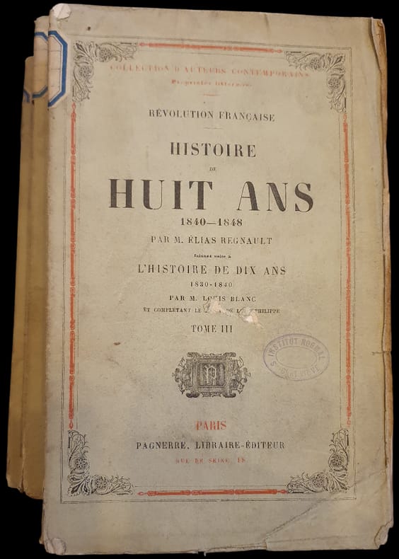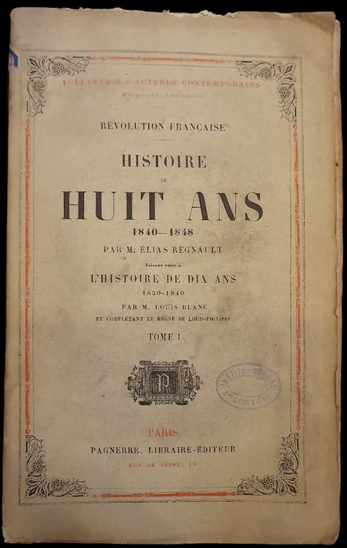 Les 56 pages finales contiennent les documents historiques (ordonnances royales, pièces diplomatiques, discours, etc.) et la table des matières. — Élias Regnault (1801-1868) est un personnage peu connu. Né à Londres en 1801, Regnault, après s’être d’abord intéressé à la médecine légale, a écrit de nombreux ouvrages à caractère historique et politique, et notamment, en 1841, une “Histoire criminelle du gouvernement anglais” dans laquelle il expose « les hideuses annales du gouvernement anglais », œuvre d’une « odieuse communauté de marchands féodaux ». Il recense minutieusement dans cet ouvrage qui constitue une sorte de « livre noir » de l’Angleterre libérale, les drames et les ravages que la politique anglaise a engendrés partout dans le monde, en Angleterre d’abord, mais aussi en Amérique, en Irlande, en Chine, en Inde et ailleurs. Très favorable à Napoléon Ier, il a consacré à ce dernier une “Histoire de Napoléon” publiée en 1846. Puis il a fait partie de cabinets ministériels au début de la Seconde République. Et enfin, il a écrit au cours de la Seconde République et tout au début du Second Empire, une “Histoire de Huit ans (1840-1848)” en trois volumes, qui se voulait, mais avec de moindres proportions, le prolongement de “l’Histoire de Dix ans” de Louis Blanc. Cet ouvrage d’un ton beaucoup plus serein que les précédents, traite de la période où Guizot a dirigé le pays. Cet ouvrage publié en 1851-1852 a été republié en 1860 et en 1870. (Raymond Huard, François Guizot, homme de pouvoir vu par l’histoire républicaine de l’époque, 2010)