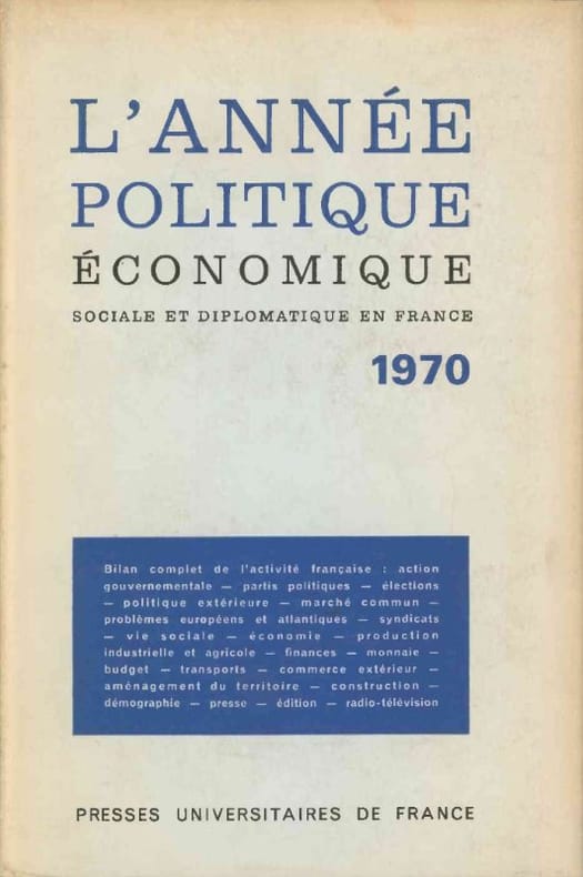 Toute l'histoire de la France en 1970 est retracée dans ce volume de L'Année politique. On y trouvera le récit vivant, objectif, clair et précis de l'évolution politique, économique et sociale et de la politique extérieure pendant l'année écoulée. La partie documentaire, très développée, permet de faire rapidement le point dans tous les secteurs de l'activité nationale : production industrielle et agricole, échanges, prix, monnaie, budget, transports, construction et urbanisme, aménagement du territoire, santé publique, population, enseignement, presse, édition, radio-télévision. On dispose ainsi en un seul volume d'une masse d'informations qu’il fallait auparavant rechercher dans de nombreuses publications dispersées. Les textes les plus importants sont reproduits en annexe : conférences de presse, déclarations politiques, documents diplomatiques. L'Année politique 1970 constitue ainsi un instrument d'information, de documentation et de référence indispensable.