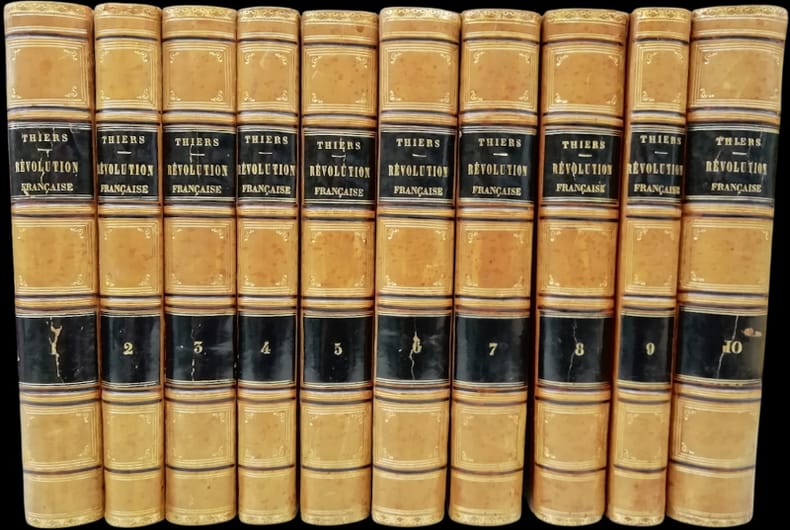 Publiée de 1823 à 1827, cette “Histoire de la Révolution” valut à Adolphe Thiers de nombreux éloges et son élection à l'Académie Française en 1833. — "Comme son ami Mignet, Thiers est partisan d'une histoire philosophique, d'une histoire qui explique. Il revendique les acquis de la Révolution puis ceux du Consulat et de l'Empire. Son fatalisme le conduit à porter la raison d'État au rang de vertu. Il exalte l'ordre et trouve une légitimation à la grandeur, fut-elle guerrière. Subordonnant l'histoire à la politique, il destine ses ouvrages aux dirigeants et les conçoit comme une propédeutique du pouvoir. L'historien sert le politique. Cependant, le Thiers historien est encore plus un peintre qu'un philosophe. Très narratif et descriptif, il est un remarquable vulgarisateur qui veut tout savoir de l'époque qu'il évoque pour mieux la faire comprendre. Il est ainsi l'un des pionniers de l'histoire scientifique (utilisation des archives, visite des lieux décrits comme les champs de bataille, recours à des témoins directs et à des spécialistes). Entre la légende dorée et la légende noire, il inscrit son oeuvre dans l'histoire critique. Après avoir encensé le génie de Napoléon, il sait infléchir son jugement après le 2 décembre. Il est désormais convaincu que la patrie ne peut se livrer à un « homme providentiel ». Jean Tulard déplore que Thiers, en dépit de ses erreurs et de ses lacunes, n'ait pas été réédité, contrairement à Taine ou à Michelet..." (Eric Anceau, Revue historique, 1999) — Alfred Nettement louait en ses termes les qualités de l’auteur : « C’est le naturel et la puissante imagination de cet esprit supérieur, qui semble évoquer les temps qu’il décrit, montrer ce qu’il peint et qui fait palpiter le cœur de ses lecteurs aux émotions de la génération de 1789 ; c’est le sens profond avec lequel il explique les situations, la clarté et l’intérêt saisissant avec lequel il expose les grandes affaires, les finances, la diplomatie, la politique ». Si cette opinion peut paraître aujourd'hui trop laudative, il n’en pas moins vrai que cette “Histoire de la Révolution” reste une grande synthèse qu’il faut absolument connaître.