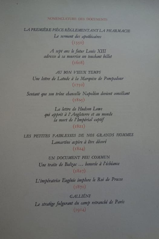 1. Pièces rarissimes sur la grande et la petite Histoire. – 2. Quelques reliques émouvantes du passé. – 3. Reliques émouvantes ou curieuses de l'Histoire. – 4. Quinze documents historiques curieux et rares. – 5. 150 ans de conquête des cœurs. – 6. Une dernière sélection de 15 émouvantes reliques. – 7. De l'officier corse au martyre de Sainte-Hélène. – 8. Quelques reliques émouvantes de l'Histoire de France. – 9. Une gerbe éblouissante de pièces historiques. – 10. Du fond de l'abîme vers la résurrection. — "La publication toute récente d'« Une gerbe éblouissante de pièces historiques », dernier album d'une collection vraiment unique de fac-similés, ramène l'attention sur le long et méritoire effort d'un chercheur érudit, M. Maurice Devriès, qui depuis vingt ans explore les bibliothèques, les musées, les administrations publiques, les collections particulières de France et de l'étranger pour y découvrir les pièces les plus dignes d'être proposées à notre vénération. En rassemblant ainsi, par une méthode de reproduction dont il a le secret et dont l'exactitude est surprenante, ces documents rarissimes mais épars, c'est un musée innombrable de l'histoire de France que M. Maurice Devriès fait pénétrer chez nous ; ses albums mettent en effet dans nos mains une image si fidèle de ces précieuses reliques qu'on croit voir les originaux avec leurs maculations, leurs ratures, leur encre jaunie, leur papier vieilli, aux angles usés, aux bords amincis, les taches de sang d'un Marat et d'un Robespierre, ou la trace des larmes d'une Marie-Antoinette qu'attend la charrette fatale. Si l'on tentait un essai de classement de toutes les pièces dont se compose cette collection on serait amené à grouper d'une part les documents qui relèvent de la grande histoire ainsi vulgarisée, et d'autre part ceux qui apportent à la petite histoire, par des faits piquants généralement ignorés, une non moins précieuse contribution. Feuilletons ensemble les pages de ce dernier album paru : ce texte en elzévir, c'est le serment que devaient prêter au XV siècle les "apoticaires chrestiens et craignans Dieu". Ils juraient notamment "de ne médire d'aucun de leurs anciens maistres", de n'enseigner point "aux idiots" les secrets de la médecine, de respecter les femmes, de ne leur donner jamais à boire aucune potion abortive, "de ne donner jamais à boire aucune sorte de poison à personne, et ne conseiller à aucun d'en donner, non pas mesmes à ses plus grands ennemis". Sur cette autre page est inséré le gracieux billet de Louis XIII enfant à sa bonne nourrice : la nature sensible et refoulée du fils de Henri IV, sevré de tendresses par son insupportable mère Marie de Médicis, apparaît toute dans cette prière touchante : "Memie Vitry, je désire que vous me véniés bien tost voir et que me reniés tousiours vostre bon amy. Loys." Tournons encore quelques pages. Nous avons sous les yeux une lettre de Latude, dit Danry, l'aventurier aux six noms, lettre adressée à la marquise de Pompadour. Il s'avise après cent quatre-vingt-huit jours de dure captivité à la Bastille, puis au donjon de Vincennes, qu'il est grand temps pour lui d'afficher un vif repentir et d'implorer grâce et pardon. Un stupide stratagème de son invention l'a poussé, dans l'espoir de soutirer quelque argent à la favorite de Louis XV, à lui dénoncer un attentat par colis explosif dirigé contre sa personne, alors qu'il était lui-même l'auteur de cet envoi, d'ailleurs inoffensif. Cette sottise devait lui valoir trente-cinq ans d'internement, entrecoupé d'évasions précaires qui chaque fois aggravèrent son cas. En quels termes essaie-t-il d'apitoyer sa "victime" ? "Si la misère, gémit-il, présé par la faim, ma fait comettre une faute contre votre chère personne, ça na point été dans le dessint de vous faire aucun mal... Si la divine personne du plus grand Roy de la terre me fait la grâce d'obtenir de votre générosité la liberté, je mourray plutôt et mangeray que des racines avant que de l'exposer une seconde fois." La poignante supplique de ce malheureux provient du fonds "Bastille" de la bibliothèque de l'Arsenal. Elle demeura sans réponse. Parvint-elle jamais à destination ? Nous avons gardé pour la fin une lettre du cher grand Lamartine, datée d'octobre 1824. Le poète a trente-quatre ans, ses Premières Méditations (1820) et ses Nouvelles Méditations (1823) lui ont ouvert toutes grandes les voies de la renommée ; un bout de ruban rouge obtenu par faveur n'ajouterait rien à sa gloire naissante, et pourtant il le sollicite. Petite faiblesse d'un grand poète ! Il écrit au bas d'une lettre banale, qui n'a d'autre objet que d'amener ce post-scriptum, sans avoir l'air d y toucher : "Si réellement vous êtes en veine de crédit et de puissance, ne pourriez-vous pas me faire avoir la croix de la Légion d'honneur ? Vous vous étonnez de ma vanité, mais cela aurait pour moi quelques résultats qui ne seraient pas tous vanité." M. Devriès ne nous donne pas le nom de l'homme "puissant" à qui était adressée cette requête. Quoi qu'il en soit, Lamartine fut fait chevalier, mais n'accéda jamais à de plus hauts grades. Sans doute en eut-il moins le goût à mesure que la destinée le comblait d'honneurs plus solennels. Se rappelle-t-on sa boutade à un ami qui postulait la croix ? "Qu'est-ce qu'un honneur qu'on perd en ôtant son habit !" Le temps qui change tout change aussi nos humeurs." (Maurice Duval, Le Monde,1950)1. 92. 93. 94. 95. 156. 167. 158. 99. 910. 46