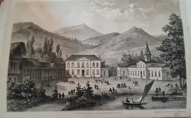 Depuis longtemps fréquentées par les habitants des contrées voisines, c'est au XVIe siècle que les eaux de Pougues étendirent leur renommée, grâce à la consécration apportée par les rois de France et les plus hauts personnages de la cour. Henri III ouvrit la série de ces puissants protecteurs. Lors de son deuxième séjour, il fut accompagné de Catherine de Médicis qui fit construire un couvent confié à des capucins pour procurer asile, soins et nourriture aux malades qui venaient des pays lointains. Henri IV y soigna ses coliques néphrétiques et sa goutte. Louis XIV fut si satisfait qu'il rendit un édit pour le transport des eaux. Jean-Jacques Rousseau, furieux de la fermeture de la grille entourant la fontaine, écrivait « qu'on vend au poids de l'or l'eau qu'ici l'on veut boire ». Au XIXe siècle, « joli petit bourg dans le centre de la France, sans aspect grandiose ni terrible », Pougues se développera du côté de l'ouest, le besoin de loger chaque année des visiteurs riches et nombreux donnant aux habitations « un cachet de coquetterie et de confort » inhabituel en milieu rural. En 1875, les hôtels qui accueillent les buveurs d'eau sont au nombre de quatre : hôtel des Eaux, hôtel des Bains, hôtel des Baigneurs, hôtel du Cheval Blanc ou hôtel Petit. Pour les curistes, « c'est la vie de famille avec toutes les convenances du monde, avec toutes les délicatesses d'une bonne éducation », occupée en priorité par les soins du traitement, mais laissant la place également aux divertissements et à la promenade. Un casino construit face à l'établissement hydrothérapique offre salle de lecture, fumoir, concerts, bals, pièces de théâtre, tables de jeux, billards, etc. Après avoir exposé les vertus et les inconvénients des eaux de Pougues, le Dr Roubaud propose en complément du traitement une série d'excursions, que le curiste pourra faire à pied ou en voiture, pour « prévenir l'ennui mortel et le découragement funeste ». C'est l'occasion de rappeler quelques éléments du passé des environs : le château ducal élevé à Nevers par Jehan de Clamecy ; Prémery, résidence d'été des évêques de Nevers ; les forges réputées de Guérigny ; la chronique du château de Remeron ; La Charité, ville monacale ; l'église de Germigny ; le musée de pipes de Garchizy. Ce guide médical et touristique, très simple et d'un accès facile, donne de nombreux renseignements sur la société au XIXe siècle, ainsi que sur une activité économique alors florissante à Pougues-les-Eaux (Nièvre). (Micberth)