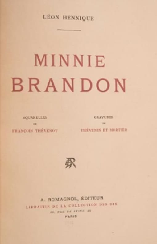 Édition de luxe (et première édition illustrée) tirée à 300 exemplaires seulement. En fin d'ouvrage on trouve la décomposition de la gravure du frontispice en quatre couleurs ainsi que le Bulletin de souscription accompagné d'une gravure (4 p.) — Auteur d'une œuvre romanesque aujourd'hui tombée en grande partie dans l'oubli, Léon Hennique fait partie de l'école naturaliste. Il fut très influencé par Zola et Maupassant. “Minnie Brandon” est une histoire d’amour dont l’héroïne est une Anglaise alcoolique. — "Le courant naturaliste nous donne aussi, parmi ceux qui furent le plus près de Zola, Léon Hennique, possesseur d’une formule concise et pleine dont le livre le plus récent, “Minnie Brandon”, d’une forte étoffe, d’une sobre exécution, reste digne de son roman le plus connu, “Un Caractère”." (Gustave Kahn, Symbolistes et décadents, 1902) — "Ce roman mériterait d'être réédité et relu." (Jacques Cellard, Le Monde, 1980)