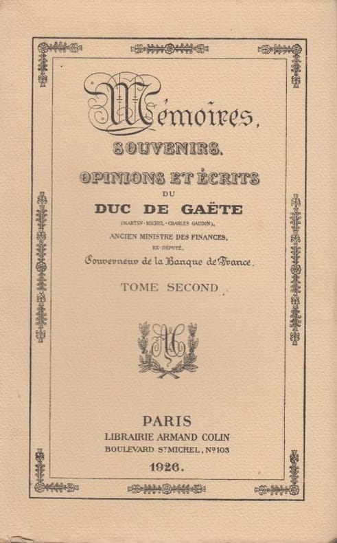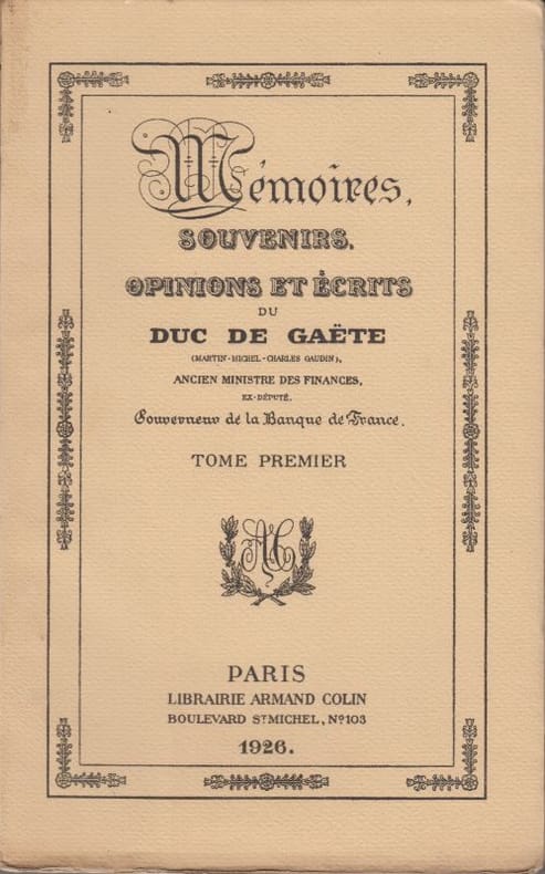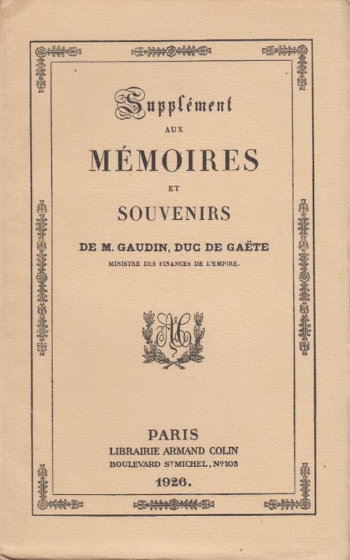 Réimpression en fac-similé tirée à 1100 ex. numérotés des très rares et très importants mémoires du ministre des finances de Napoléon (P., Baudouin, 1826 pour les tomes I et II, P., Imp. de Goetschy, 1834, pour le troisième volume de “Supplément”). — Cet ouvrage traite presque exclusivement des finances. Martin Michel Charles Gaudin, duc de Gaëte (1756-1841), entra à l'âge de dix-sept ans dans les bureaux des contributions publiques, et fut mis à la tête d'une division de ce service lors du premier ministère de Necker ; nommé, en 1791, l'un des six administrateurs de la Trésorerie nationale, il démissionna lors de la Terreur mais accepta le portefeuille des finances après le 18 brumaire, qu'il conservera jusqu'à la chute de l'Empire. Il réorganisera totalement l'administration du système des finances : reprise de l'opération du cadastre décrétée par l'Assemblée constituante, création de la Cour des comptes, établissement d'un nouveau systême fiscal. Gaudin est le remarquable auteur du système moderne de l'administration des finances. N'étant pas un homme de parti, Louis XVIII lui donna la direction de la Banque de France en 1820, il y restera jusqu'en 1834. — "Ces mémoires sont d'une grande importance pour l'histoire des finances impériales." (Tulard, 600) — Publié en 1826, le premier tome de cet ouvrage est de la plus saisissante actualité. On y voit comment le ministre de Bonaparte, puis de Napoléon, empereur, sut dénouer une crise aussi grave que celle que nous traversons aujourd'hui ; dans le tome second, on trouvera maintes suggestions fécondes du célèbre financier sur la caisse d'amortissement, le monopole des tabacs, etc. ; le troisième et dernier volume, d'un intérêt plus vif encore que les précédents, contient le récit anecdotique du duc de la collaboration du duc de Gaëte avec l'Empereur, et, en appendice, une note encore inédite sur la Banque de France, de la plus vivante actualité. (L'Editeur) Désormais les frais d'envoi sont de 6 € seulement pour les livres jusqu'à 1 kg (colissimo suivi), pour la France métropolitaine.