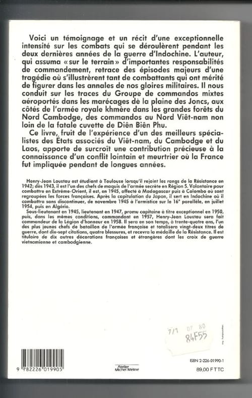 L'auteur a servi en Indochine sans discontinuer de novembre 1945 à juillet 1954. Il nous conduit sur les traces du Groupe de commandos mixtes aéroportés dans les marécages de la plaine des Joncs (Opération Choc en juillet 1952), aux côtés de l'armée royale khmère dans les grandes forêts du Nord Cambodge en 1953, avec les commandos au Laos et au Nord Viêt-nam (Opérations Condor et Albatros en mai-juin 1954, mises sur pied pour tenter de porter secours aux rescapés de Dien Bien Phu). — "Voici un témoignage et un récit d'une exceptionnelle intensité sur les combats qui se déroulèrent pendant les deux dernières années de la guerre d'Indochine. L'auteur, qui assuma "sur le terrain" d'importantes responsabilités de commandement, retrace des épisodes majeurs d'une tragédie où s'illustrèrent tant de combattants qui ont mérité de figurer dans les annales de nos gloires militaires. Ils nous conduit sur les traces du Groupe de commandos mixtes aéroportés dans les marécages de la plaine des Joncs, aux côtés de l'armée royale khmère dans les grandes forêts du Nord Cambodge, des commandos au Nord Viêt-nam non loin de la fatale cuvette de Diên Biên Phu. Ce livre, fruit de l'expérience d'un des meilleurs spécialistes des Etats associés du Viêt-nam, du Cambodge et du Laos, apporte de surcroît une contribution précieuse à la connaissance d'un conflit lointain et meurtrier où la France fut impliqué pendant de longues années."