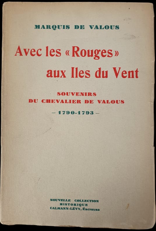 Entré dans la marine en 1778, le chevalier de Valous se trouve à la station navale des îles sous le Vent lorsque éclate la Révolution en France. Il raconte de façon détaillée dans ses souvenirs l'agitation grandissante à la Guadeloupe, à la Martinique, à Saint-Domingue. En 1793, excédée par l'anarchie, la flotte entière refuse de continuer à servir la Révolution et passe sous le pavillon du Bourbon d'Espagne. Ces souvenirs sont du plus haut intérêt pour l'histoire des Antilles françaises entre 1789 et 1793. Peu de témoignages nous sont parvenus sur l'action de la marine française aux Antilles au début de la Révolution et sur le passage de certains de ses régiments à la contre-révolution. (Fierro, 1434) — "M. de Valous nous donne le texte complet des Souvenirs de son aïeul, accompagné de notes qui en font une manière d'histoire de la Révolution dans ces parages, envisagée d'un point de vue un peu particulier. C'est celui d'un officier de la marine royale, que frappe surtout le caractère désordonné de ces mouvements, et qui réagit contre eux en militaire et en royaliste. Toute sa sympathie va naturellement aux représentants de l'autorité régulière et à leurs soutiens, parmi lesquels il signale, au premier rang, – il y a peut-être quelque exagération, – les propriétaires de la classe des mulâtres et des gens de couleur libres, à rencontre des petits blancs et des marins du commerce, toujours prêts à se mettre du côté de l'émeute. Mais le principal intérêt de ce document est de nous montrer, en quelque sorte par le dedans, l'évolution de l'état des esprits dans les états majors, et comment ceux de la division Rivière finirent par se trouver conduits, en quelque sorte malgré eux, à se réfugier à l'étranger et à livrer leurs bâtiments, pour échapper aux mauvais traitements des Anglais, à qui tous les Français restaient encore des ennemis, aux autorités espagnoles, qui du moins les accueillirent avec un peu d'humanité." (Revue de l'histoire des colonies françaises, 1931)
