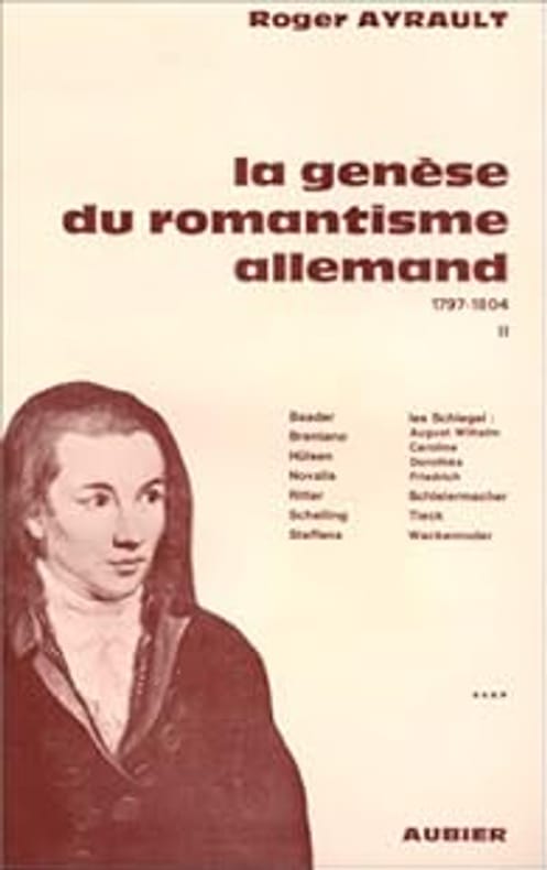 Complet. — "Une admirable synthèse dont le propos n'est pas tant de définir ce qu'est le romantisme allemand que de décrire, en s'appuyant sur une analyse rigoureuse des événements et des œuvres, le long processus qui l'a enfanté. L'originalité de l'ouvrage est d'abord dans la démarche choisie par R. A. Les deux premiers volumes présentaient la quadruple crise, politique, philosophique, religieuse et esthétique, qui caractérise la situation spirituelle de l'Allemagne dans la deuxième moitié du 18e siècle et en révèle les multiples contradictions, auxquelles seul le romantisme, parce qu'il est « disponibilité et accueil indéfinis » (alors que le classicisme est « surtout repliement », t. I, p. 49), saura s'ouvrir, après s'être affranchi de la présence de l'antiquité qui obsédait le classicisme. Cette disponibilité est à l'origine de ce que R. A. appelle « l'esprit d'Iéna » qui domine, entre 1797 et 1804, le premier romantisme allemand et dont les tomes III et IV reconstruisent les symboles et les productions. Autour des frères Schlegel, qui publient de 1798 à 1800 les six numéros de la revue Athenaeum, et de leurs épouses, une dizaine de jeunes hommes – Novalis, Tieck, Wackexiroder, Scheliing, Brentano, Baader, Schleiermacher, Hiilsen, Ritter, Steffens – vont vivre, dans une intime communion d'émotions et de pensées non exempte d'orages, cette « sympathie » qui se sublime dans la « symphilosophie et son double, la sympoésie » – concepts qui ont pour origine la « fraternisation » au sens strict du terme, dont l'Athenaeum est le premier produit..." (Pierre-André Bois, Dix-Huitième Siècle, 1979)