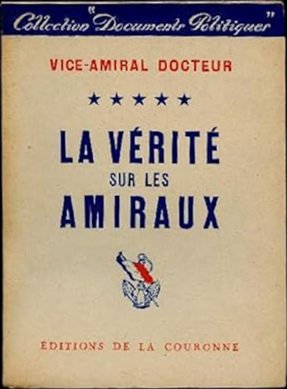 L’amiral Jules-Théophile Docteur (1868-1966) qui n’appartient plus à la Marine au moment des événements et n’a donc pas été au nombre des victimes à la Libération dresse ici un violent pamphlet contre le limogeage des amiraux restés fidèles à l’État français durant la guerre. Souvenirs et réflexions amères sur Mers-el-Kébir, le sabordage de Toulon, les débarquements en Afrique, notamment la bataille de Casablanca, sur l'assassinat de Darlan, et un chapitre concernant le jugement des amiraux ayant refusé l'autorité de De Gaulle pendant la guerre. — Table : La flotte et l'armistice ; Capture et massacre de nos navires par les Anglais ; Les débarquements en Afrique ; Le sabordage de la flotte à Toulon ; Une pléiade d'amiraux en prison.