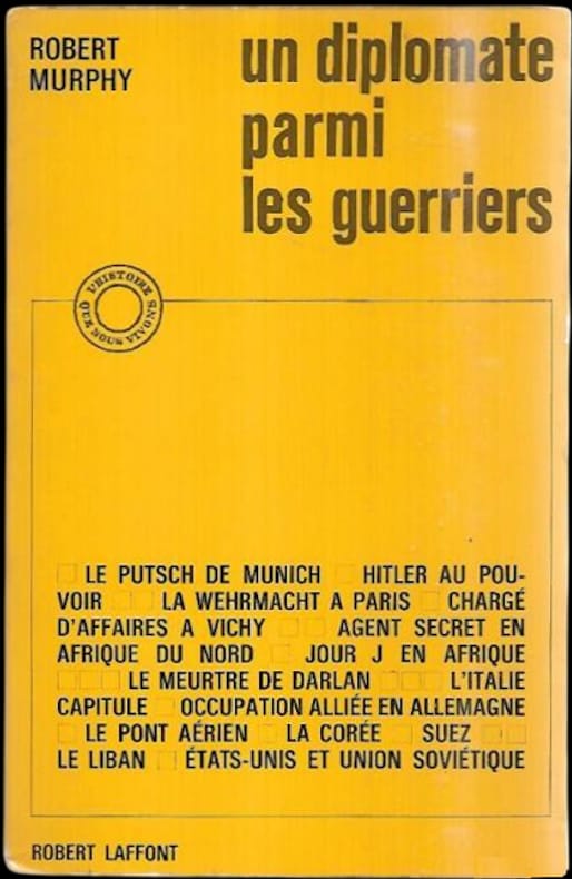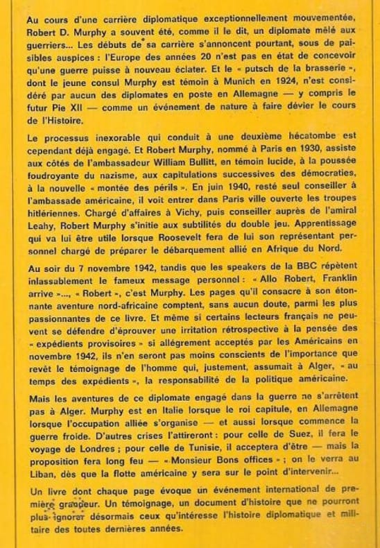 Mémoires du diplomate américain Robert Murphy. Concerne essentiellement la Seconde Guerre mondiale et notamment le débarquement en Afrique du Nord. — Table : Le putsch de Munich. Hitler au pouvoir. La Wehrmacht à Paris. Chargé d'affaires à Vichy. Agent secret en Afrique du Nord. Jour J en Afrique. Le meurtre de Darlan. L'Italie capitule. Occupation alliée en Allemagne. Le pont aérien. La Corée. Suez. — "Robert Murphy a joué un rôle très important dans la diplomatie américaine, notamment pendant la deuxième guerre mondiale, et il était particulièrement chargé des affaires françaises à Vichy d’abord, puis en Afrique du Nord. A cette époque on le considérait volontiers dans certains milieux comme un agent accomplissant des missions ténébreuses ; lui-même est convaincu que ce fut la propagande allemande qui le noircissait ainsi pour gêner son activité Cependant en France son action en Afrique du Nord n’a pas laissé un bon souvenir : il contribua fortement après le débarquement américain à Alger à faire reconnaître l’amiral Darlan, compromis par sa collaboration avec l’Allemagne, comme commandant en chef des forces militaires françaises. Il fut fort étonné de l’indignation que cette décision provoqua dans le camp des alliés et en premier lieu parmi les résistants français. Mais il la justifie en rappelant que ce qui préoccupait alors avant tout les Américains c’était de gagner la guerre, et Darlan lui paraissait à ce moment le plus capable de faciliter la tâche du corps expéditionnaire américain en Algérie et au Maroc. Avec un opportunisme qui ne tenait compte que de l’objectif immédiat, ils se servirent de l’amiral Darlan sans se soucier de heurter le sentiment de bien des patriotes français... On voit par ces quelques lignes l’intérêt que présente ce livre... On ne pourra en tout cas l’ignorer pour écrire l’histoire de cette période." (Le Monde diplomatique, 1965) — "A la fois autobiographie et document d'histoire, cet ouvrage relate les événements diplomatiques et militaires qui se sont succédé de 1917 à 1958 et auxquels R. M. a été mêlé au cours de sa carrière. Faisant appel à la fois à ses souvenirs personnels et au récit de ses missions officielles, R. M. retrace, dans un ensemble précis et cohérent, l'évolution de la politique extérieure américaine et des relations internationales, du putsch de Munich à l'affaire de l'U-2, en passant par la seconde guerre mondiale et les diverses crises et conflits où se sont trouvés impliqués les États-Unis au cours de cette période." (Revue française de science politique, 1966)