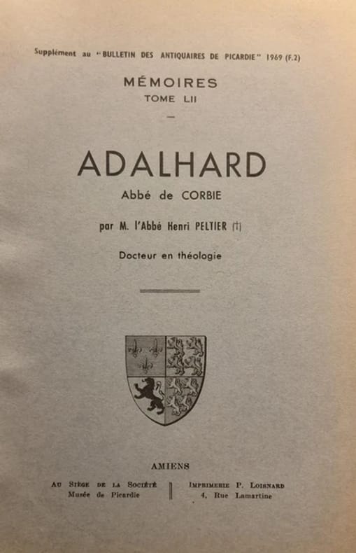 Adalhard (v. 752-826), cousin germain de Charlemagne, élevé avec lui, en devint le conseiller ; régent d'Italie, puis disgrâcié et exilé, il finit paisiblement sa vie à Corbie (Somme), qu'il organisa à la façon d'un petit royaume. — "L'abbé de Corbie Adalard appartient plus à l'histoire de la politique temporelle et spirituelle qu'à celle des doctrines, puisque ses seuls ouvrages ont été des statuts pour son abbaye et un “De ordine palatii” qui ne nous est parvenu que dans une refonte d'Hincmar, mais, outre l'intérêt de ce dernier texte, il semble bien qu'Adalard ait joué un rôle réel dans l'essor intellectuel de la communauté qu'il dirigeait. Henri Peltier nous offre une solide étude du personnage et de son milieu ; d'ailleurs si le rôle politique d'Adalard peut laisser place à des divergences d'appréciation, il n'y a aucun doute qu'il n'ait été un grand abbé et un grand religieux." (Revue des Sciences philosophiques et théologiques, 1977)