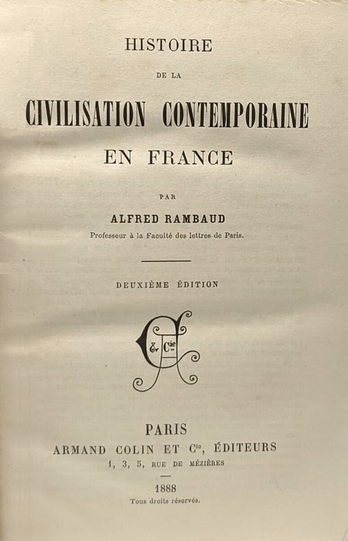 "A la fin de sa remarquable Histoire de la civilisation française depuis les origines jusqu'à 1789 (même librairie, 2 vol. in-12), M. Alfred Rambaud donnait, en une trentaine de pages, un tableau très abrégé de notre « civilisation contemporaine », se bornant à en indiquer les grandes lignes, à en mettre en lumière les caractères incontestables, à montrer ce que la France nouvelle tient de l'ancienne France et en quoi elle en diffère. Son nouveau volume, n'étant autre chose que le développement de cet essai rudimentaire, embrasse l'histoire politique et militaire, littéraire et scientifique, économique et morale du siècle dans lequel les progrès de la civilisation ont atteint leur plus large sinon leur complet épanouissement. Dans l'examen des divers régimes que nous avons essayés depuis la Révolution, l'auteur ne méconnaît aucun de leurs bons côtés, « ni les idées généreuses et humaines de la Constituante, ni l'énergie patriotique de la Convention, ni le génie organisateur de Napoléon, ni la probité parlementaire de nos deux monarchies constitutionnelles, ni l'ardent esprit de justice sociale qui animait la Seconde République, ni les grands progrès matériels accomplis sous le Second Empire ». Le plus difficile était, en abordant l'étude de la période tout à fait contemporaine, de présenter sous un jour vrai les événements et les faits du temps actuel, et, sans manquer aux égards nécessaires, de juger les hommes vivants en appréciant leur caractère et leur œuvre. M. Alfred Rambaud, qui ne voulait point laisser son livre inachevé, n'a pas reculé devant cette tâche épineuse ; il s'en est acquitté avec beaucoup de tact et de savoir, avec une préoccupation d'impartialité manifeste, mais mêlée parfois d'un peu d'optimisme." (Journal des débats politiques et littéraires)