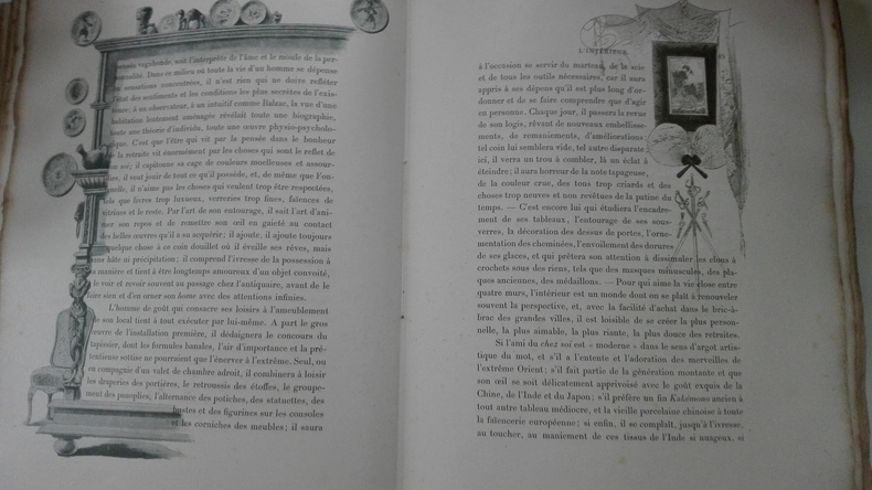 Qui mieux que Uzanne lui-même pourrait nous parler de ce livre : "De tous les livres faits par l'auteur de l’Éventail avec la collaboration de Paul Avril, celui-ci est incontestablement le mieux réussi au point de vue rendu des dessins par procédés divers, héliogravure en creux et en relief, fac-similés Gillot, chromogravures typographiques, emploi des bronzes pâles, feu, orange, verts, usage des glacis de platine et d'étain alliés aux couleurs repérées, etc. Livre essentiellement nouveau que celui-ci, il faut le dire, et qui témoigne, aux yeux des gens du métier, de mille difficultés vaincues et d'audaces décoratives heureusement couronnées de succès. Le Bibliophile, en tant qu'éditeur artistique, a quelque vanité de n'avoir rien raté dans la mise en oeuvre si complexe de ce livre. Quant au texte, il n'est peut-être pas parfait pour plaire à beaucoup, car sa philosophie antimondaine, parfois même antisociale, a le défaut d'être très personnelle et par conséquent exclusive ; l'écrivain étant d'un absolutisme de pensée rigoureux que d'aucuns trouvent très souvent excessif." (in Catalogue de Quelques-uns des Livres Contemporains en exemplaires choisis, curieux ou unique tirés de la Bibliothèque d'un écrivain et bibliophile parisien et qui seront livrés aux enchères les 2 et 3 mars 1894. Paris, Durel, mars 1894. n°440 pour ce commentaire). Si Uzanne a évoqué son attachement au contenu de ce livre qu'il place pour ainsi dire au dessus des autres à cette époque (fin 1887), voici la table des chapitres complète : Proscenium - Le Monde et la Société - Les Arts et les Lettres - L'Intérieur - L’étude - L'Amour - Le Voyage - Les Sports - La Table - Le Rêve - La Campagne - et un Appendice correctif (bien senti). Ce livre, pour l'avoir lu attentivement, malgré quelques longueurs et lassitudes au sein de quelques chapitres, nous livre la pensée d'Octave Uzanne à l'aube de ses 36 ans. Jeune célibataire (L'amour), épris de libertés et d'indépendance, ayant déjà un goût prononcé pour les voyages qu'il effectuera bientôt en grand nombre, philosophe, penseur, critique et journaliste, misanthrope aussi, déjà, rêveur presque asocial par certains aspects. Voilà l'Octave qu'il nous dépeint en quelques cent cinquante pages presque toujours richement illustrées. C'est sans doute l'un des livres les plus intimistes qu'il a donné au public avec le Paroissien du célibataire publiée en 1890. Ce livre est négligé par erreur par les catalogueurs de livres. Il doit, au contraire, occuper une place de choix dans la bibliographie de l'auteur. BEL EXEMPLAIRE FINEMENT RELIÉ DU RARE TIRAGE DE TÊTE SUR JAPON D'UNE BELLE PROVENANCE.