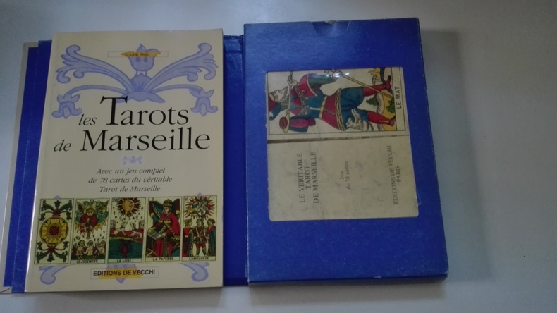 Editions De Vecchi, 2005. In-8. Broché. Couverture illustrée. 184 pages. Chaque carte illustrée NB avec son explication. Coffret également illustré contenant le livre et un jeu complet de 78 cartes du véritable tarot du Marseille. Bel état.